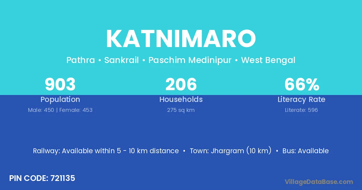 Jhargram (10 km) is the nearest town to Katnimaro village for major economic activities and is located approximately 10 km away.
