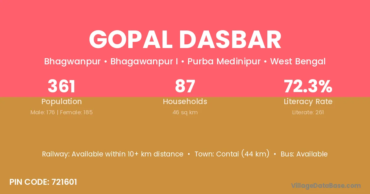 Contai (44 km) is the nearest town to Gopal Dasbar village for major economic activities and is located approximately 44 km away.