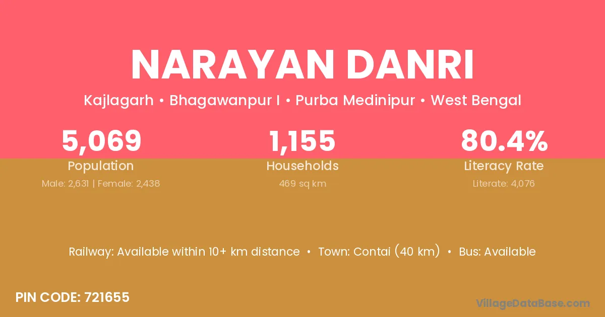 Contai (40 km) is the nearest town to Narayan Danri village for major economic activities and is located approximately 40 km away.