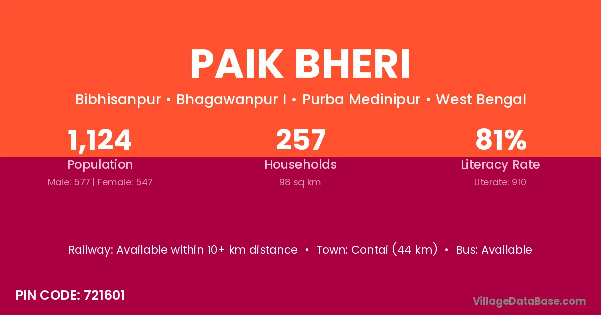 Contai (44 km) is the nearest town to Paik Bheri village for major economic activities and is located approximately 44 km away.