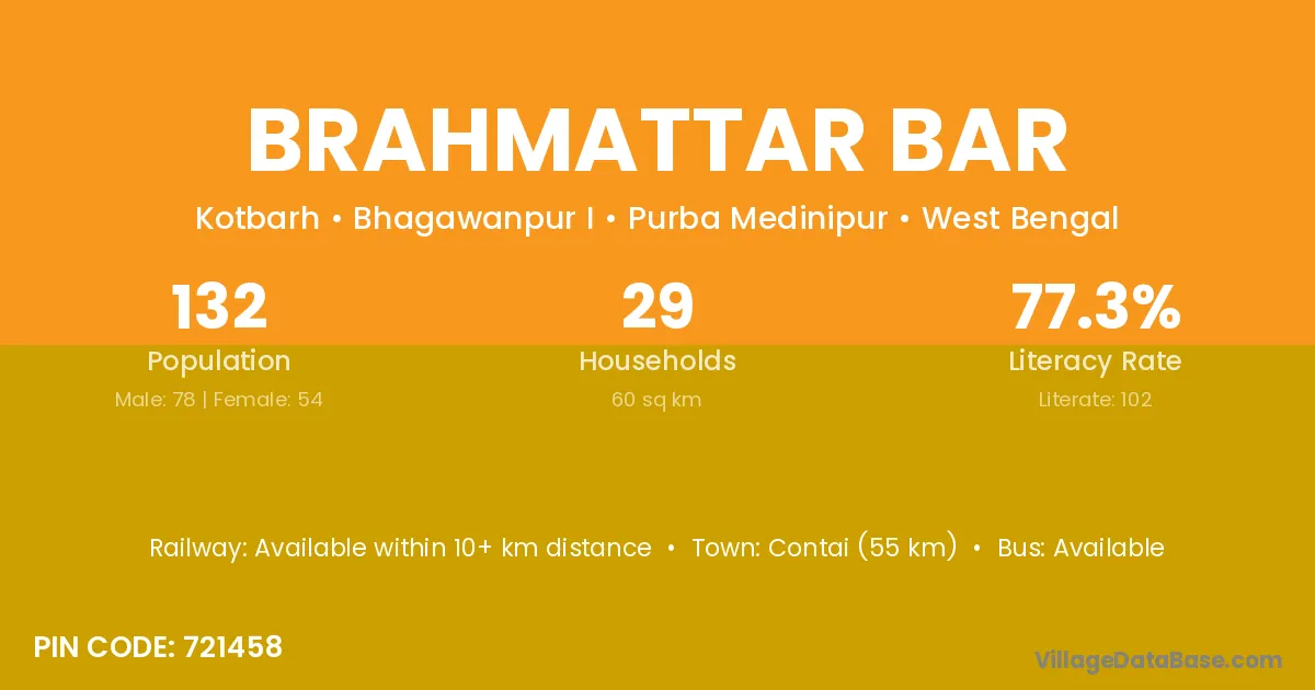 Contai (55 km) is the nearest town to Brahmattar Bar village for major economic activities and is located approximately 55 km away.