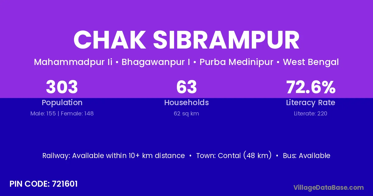 Contai (48 km) is the nearest town to Chak Sibrampur village for major economic activities and is located approximately 48 km away.