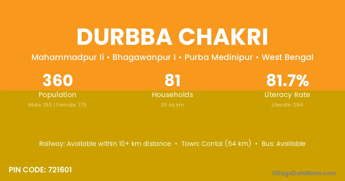 Contai (54 km) is the nearest town to Durbba Chakri village for major economic activities and is located approximately 54 km away.