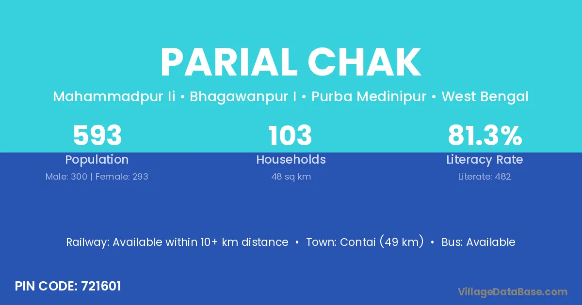 Contai (49 km) is the nearest town to Parial Chak village for major economic activities and is located approximately 49 km away.