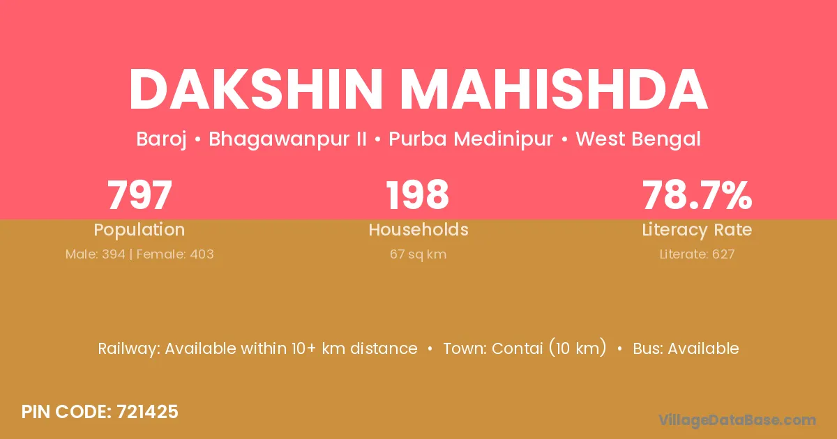 Contai (10 km) is the nearest town to Dakshin Mahishda village for major economic activities and is located approximately 10 km away.
