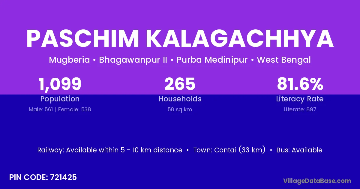 Contai (33 km) is the nearest town to Paschim Kalagachhya village for major economic activities and is located approximately 33 km away.