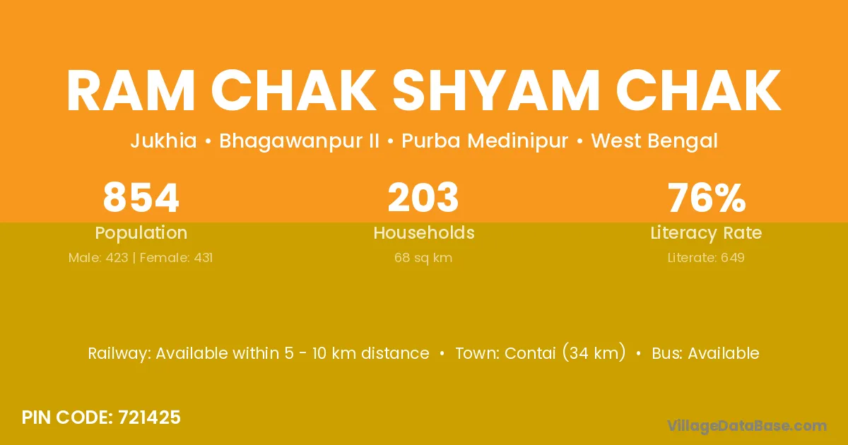 Contai (34 km) is the nearest town to Ram Chak Shyam Chak village for major economic activities and is located approximately 34 km away.