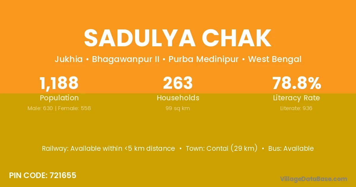Contai (29 km) is the nearest town to Sadulya Chak village for major economic activities and is located approximately 29 km away.