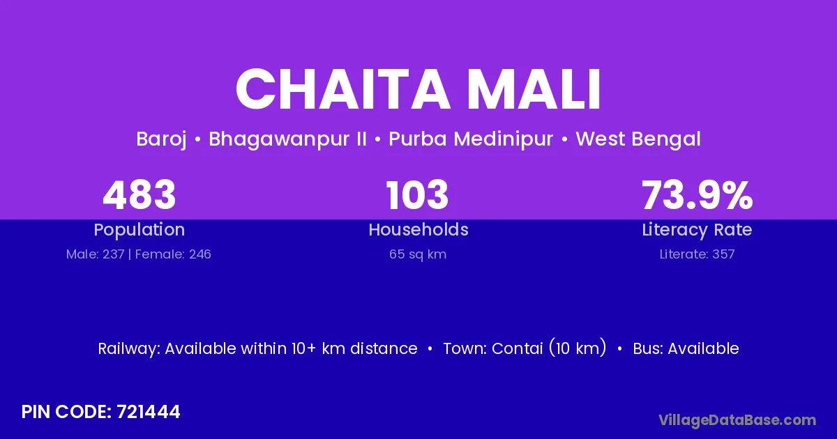 Contai (10 km) is the nearest town to Chaita Mali village for major economic activities and is located approximately 10 km away.