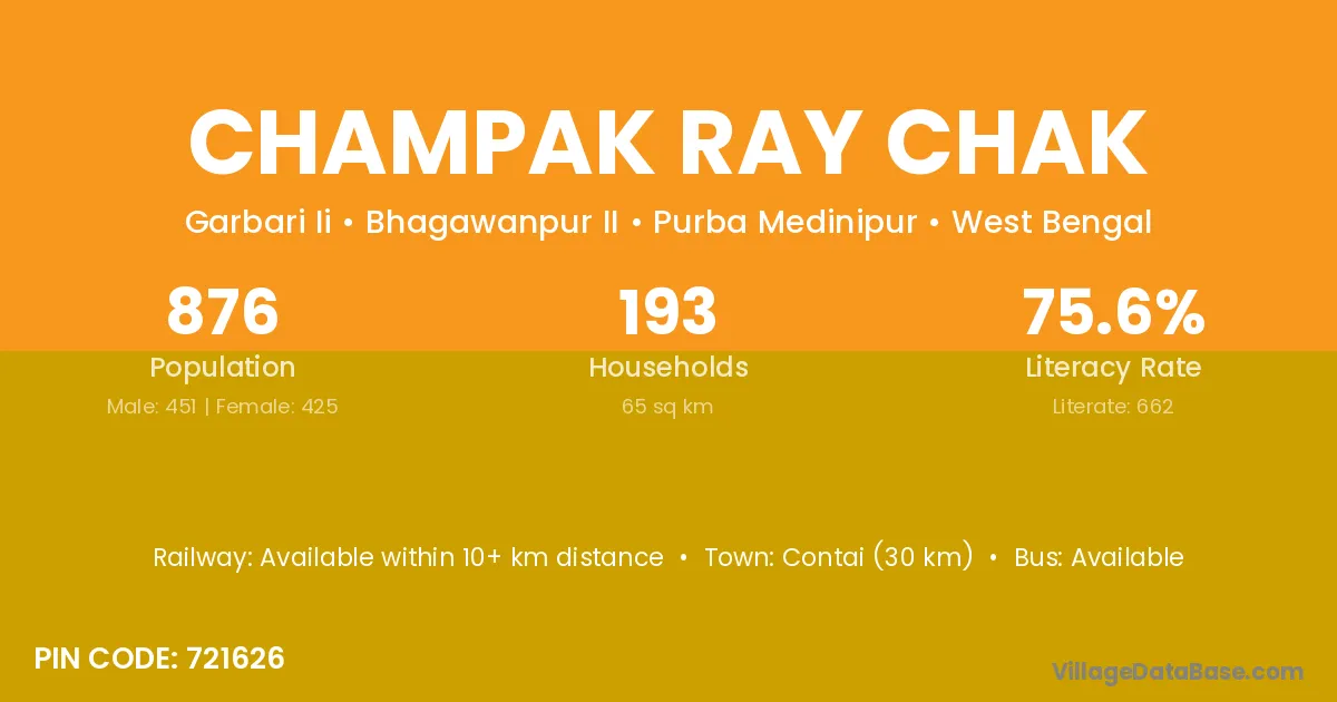 Contai (30 km) is the nearest town to Champak Ray Chak village for major economic activities and is located approximately 30 km away.