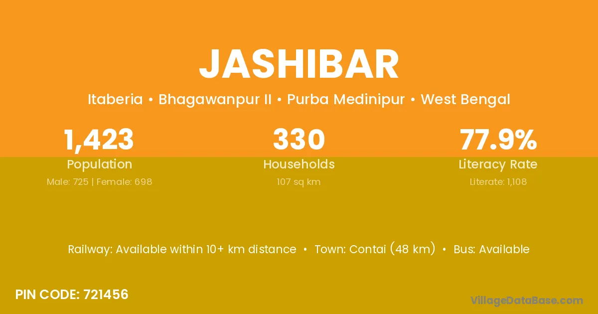 Contai (48 km) is the nearest town to Jashibar village for major economic activities and is located approximately 48 km away.