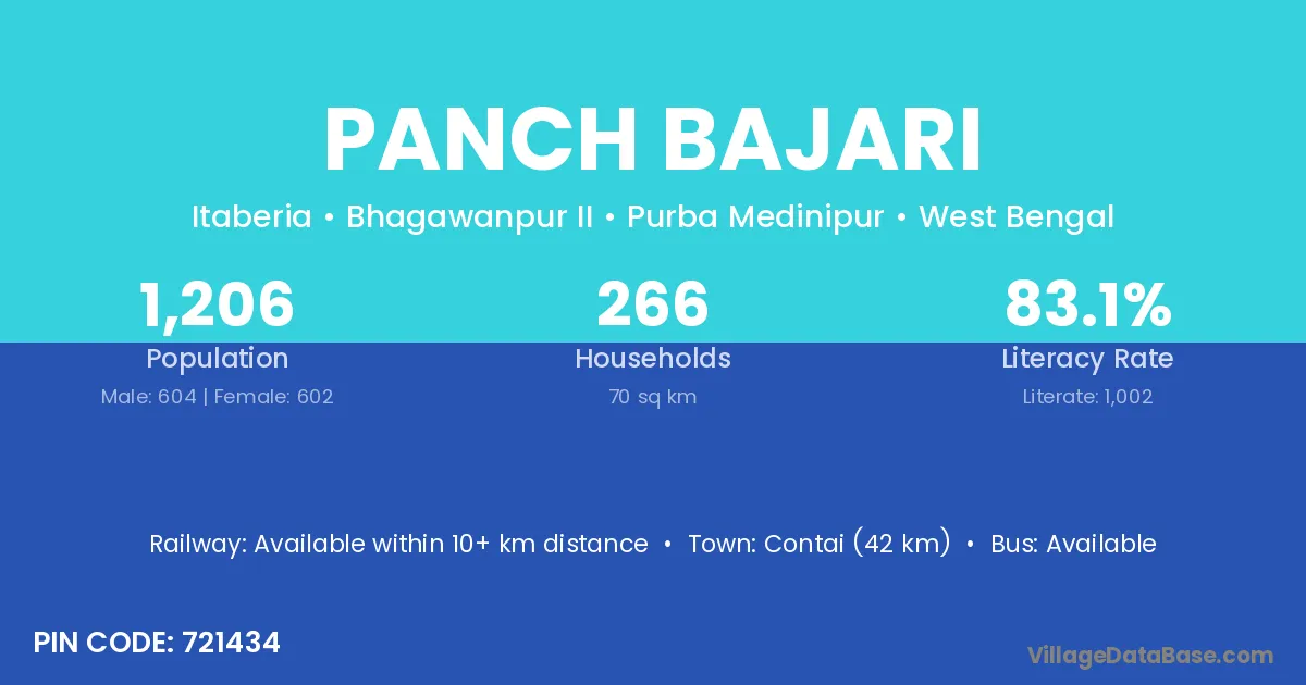 Contai (42 km) is the nearest town to Panch Bajari village for major economic activities and is located approximately 42 km away.
