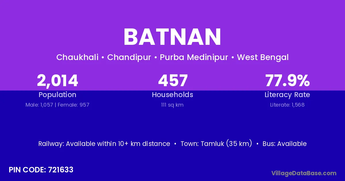 Tamluk (35 km) is the nearest town to Batnan village for major economic activities and is located approximately 35 km away.