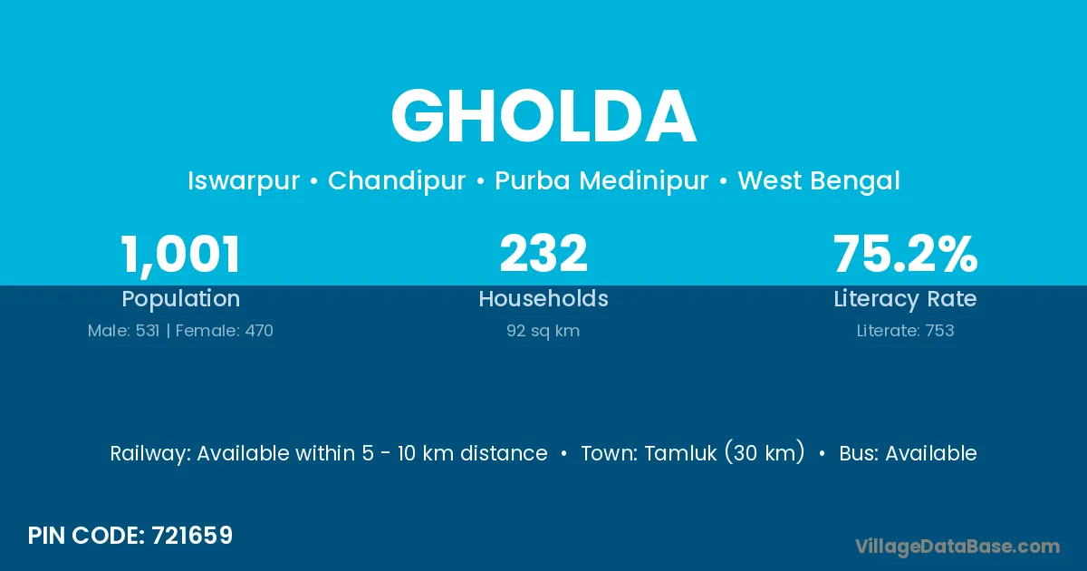 Tamluk (30 km) is the nearest town to Gholda village for major economic activities and is located approximately 30 km away.