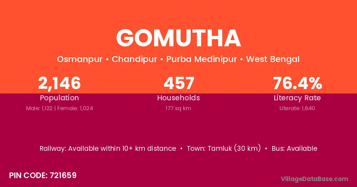 Tamluk (30 km) is the nearest town to Gomutha village for major economic activities and is located approximately 30 km away.