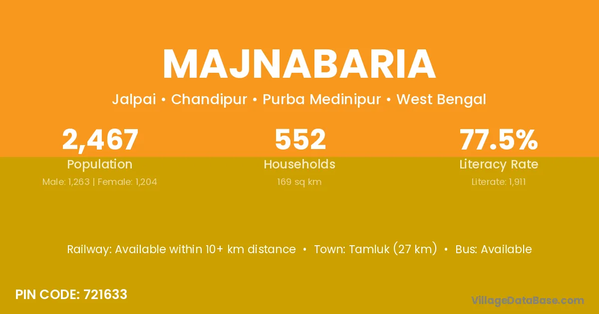 Tamluk (27 km) is the nearest town to Majnabaria village for major economic activities and is located approximately 27 km away.