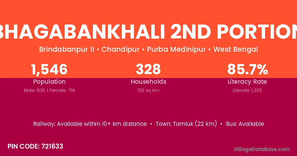 Tamluk (22 km) is the nearest town to Bhagabankhali 2nd Portion village for major economic activities and is located approximately 22 km away.