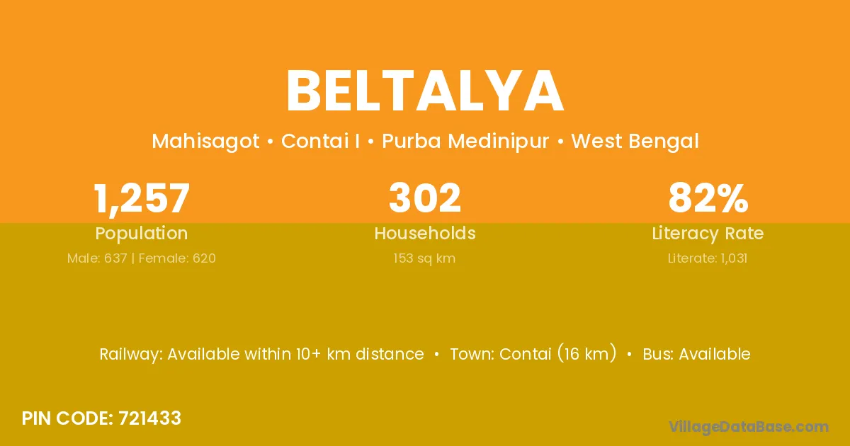 Contai (16 km) is the nearest town to Beltalya village for major economic activities and is located approximately 16 km away.