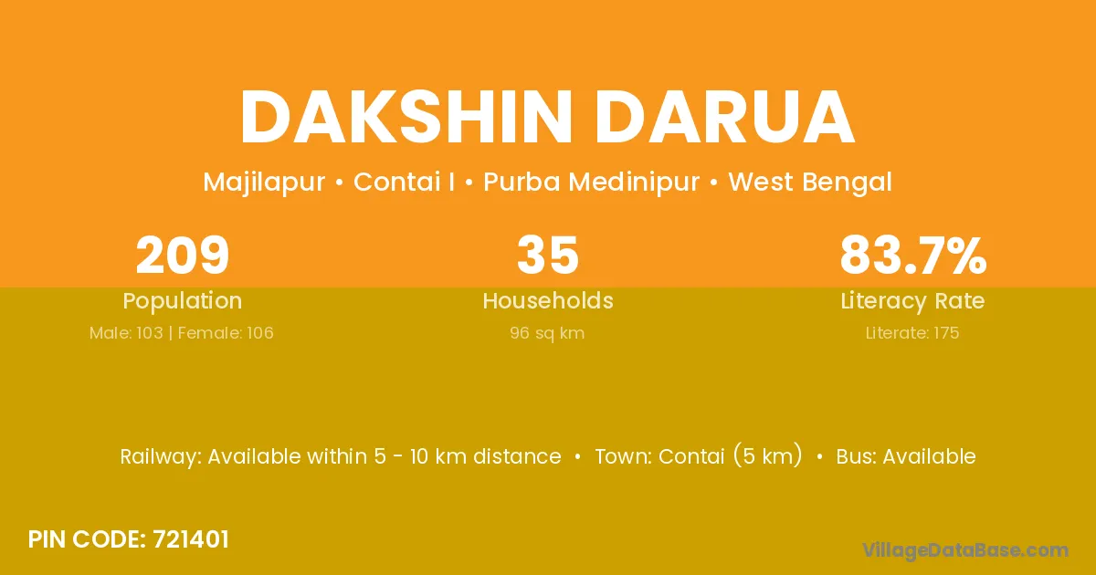 Contai (5 km) is the nearest town to Dakshin Darua village for major economic activities and is located approximately 5 km away.