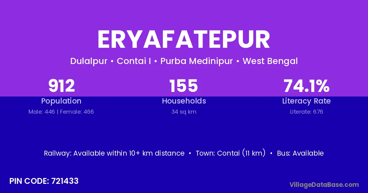 Contai (11 km) is the nearest town to Eryafatepur village for major economic activities and is located approximately 11 km away.