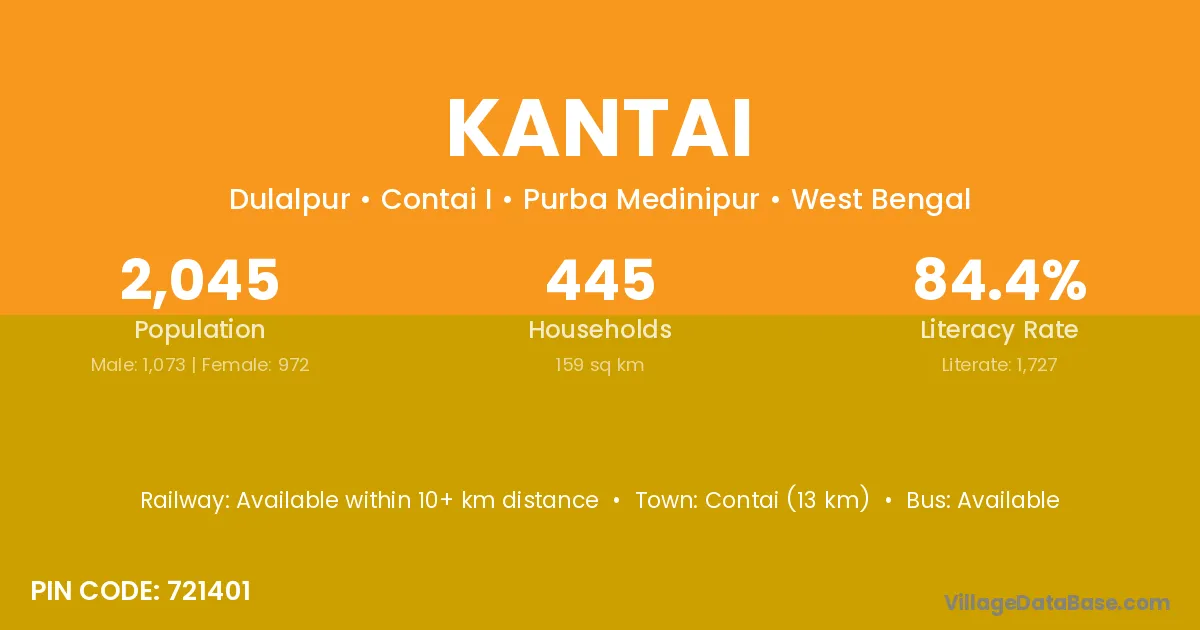 Contai (13 km) is the nearest town to Kantai village for major economic activities and is located approximately 13 km away.