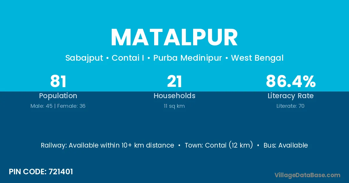 Contai (12 km) is the nearest town to Matalpur village for major economic activities and is located approximately 12 km away.