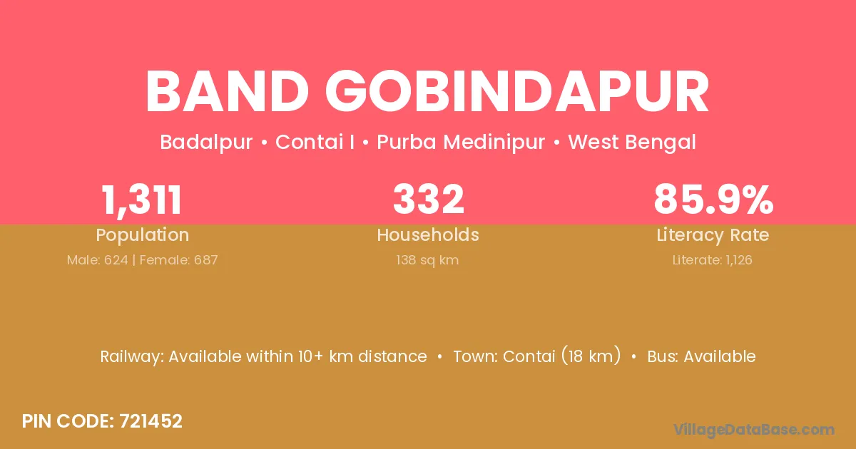 Contai (18 km) is the nearest town to Band Gobindapur village for major economic activities and is located approximately 18 km away.