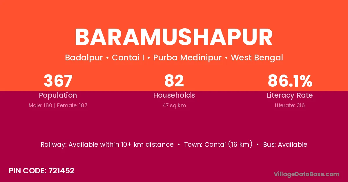 Contai (16 km) is the nearest town to Baramushapur village for major economic activities and is located approximately 16 km away.