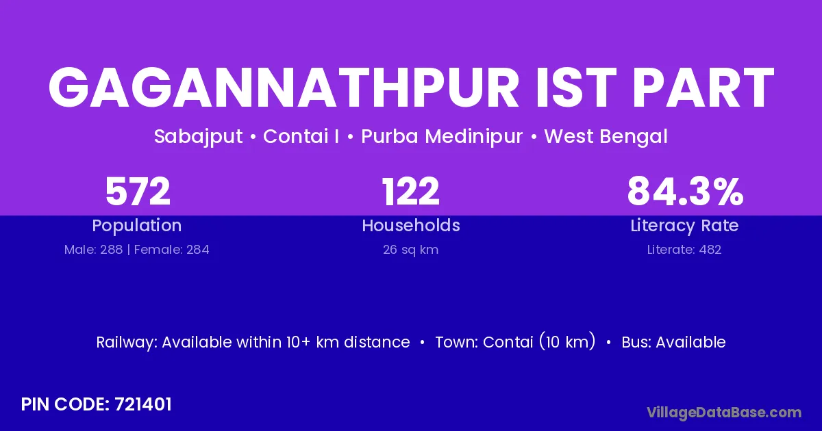 Contai (10 km) is the nearest town to Gagannathpur Ist Part village for major economic activities and is located approximately 10 km away.