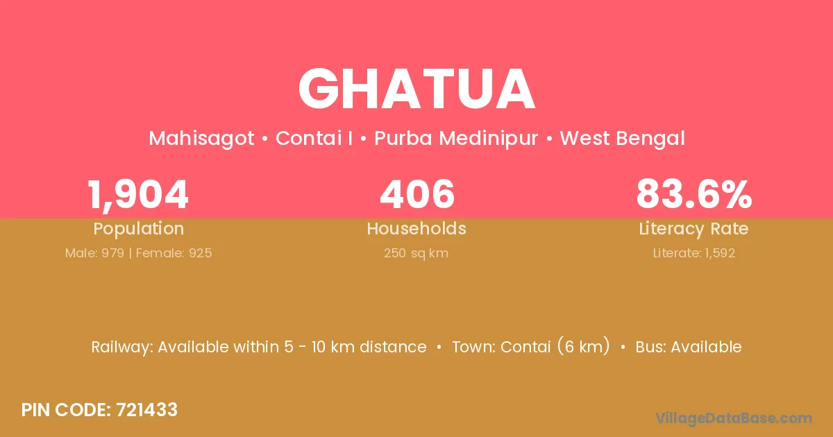 Contai (6 km) is the nearest town to Ghatua village for major economic activities and is located approximately 6 km away.