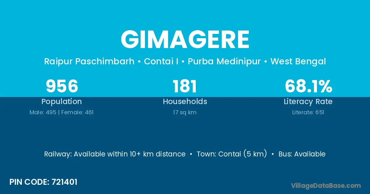 Contai (5 km) is the nearest town to Gimagere village for major economic activities and is located approximately 5 km away.