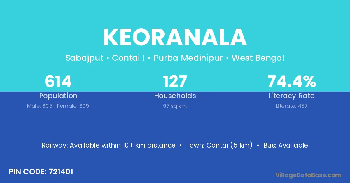 Contai (5 km) is the nearest town to Keoranala village for major economic activities and is located approximately 5 km away.