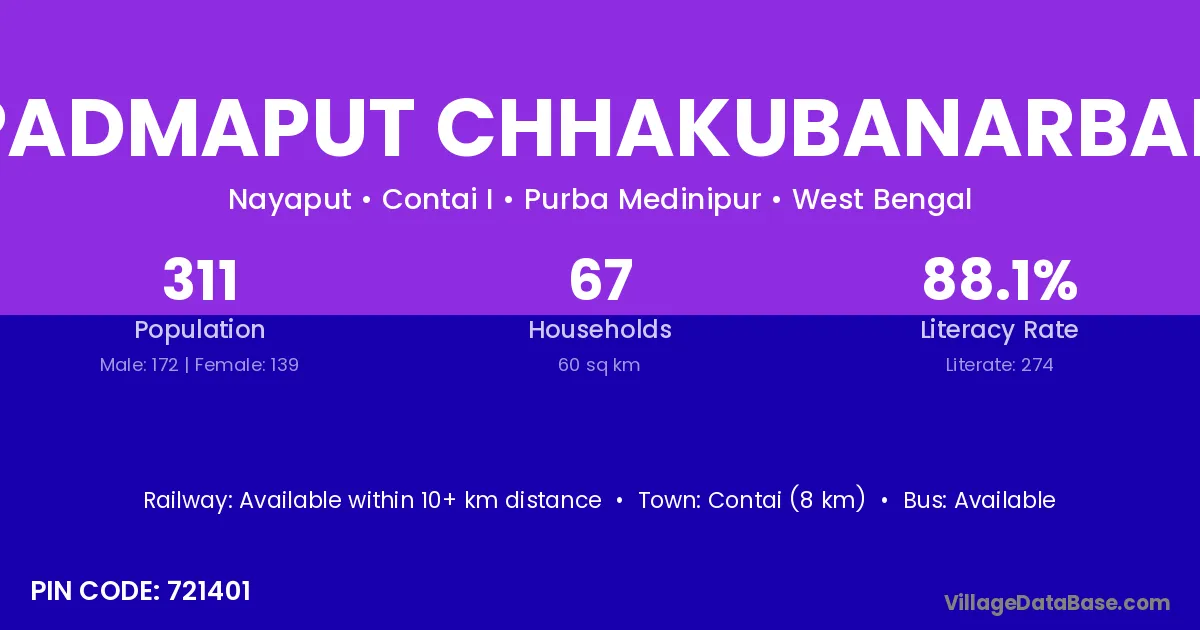 Contai (8 km) is the nearest town to Padmaput Chhakubanarbar village for major economic activities and is located approximately 8 km away.