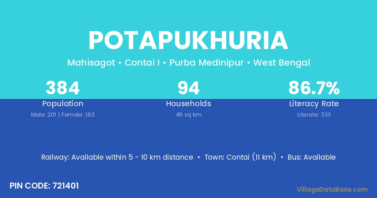Contai (11 km) is the nearest town to Potapukhuria village for major economic activities and is located approximately 11 km away.