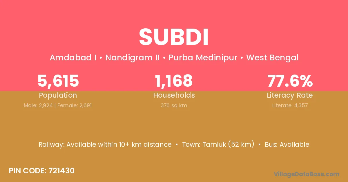 Contai (5 km) is the nearest town to Subdi village for major economic activities and is located approximately 5 km away.