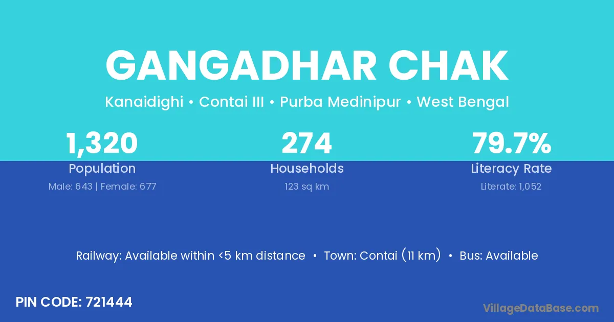 Contai (11 km) is the nearest town to Gangadhar Chak village for major economic activities and is located approximately 11 km away.