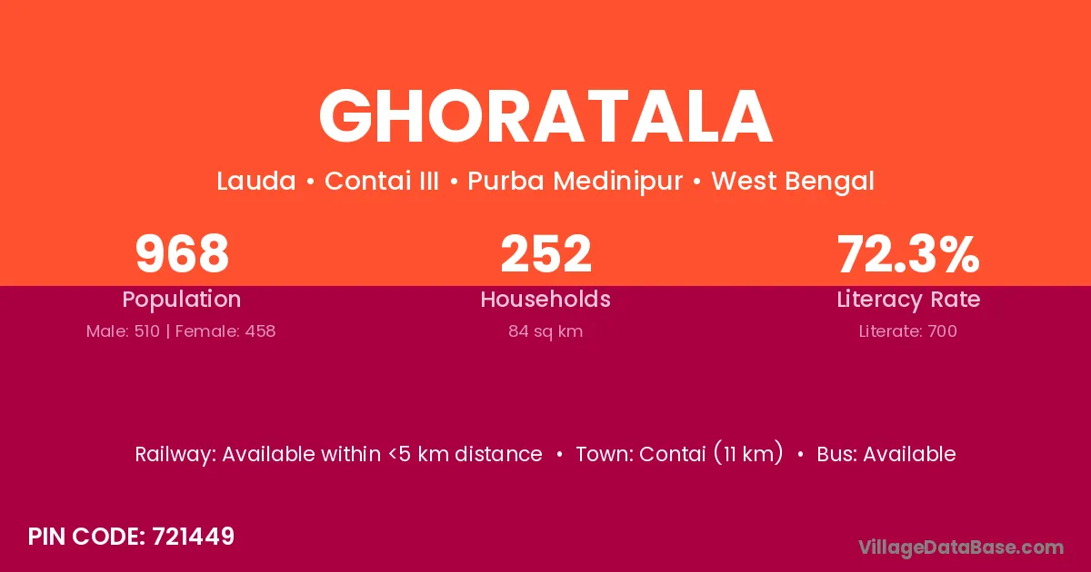 Contai (11 km) is the nearest town to Ghoratala village for major economic activities and is located approximately 11 km away.