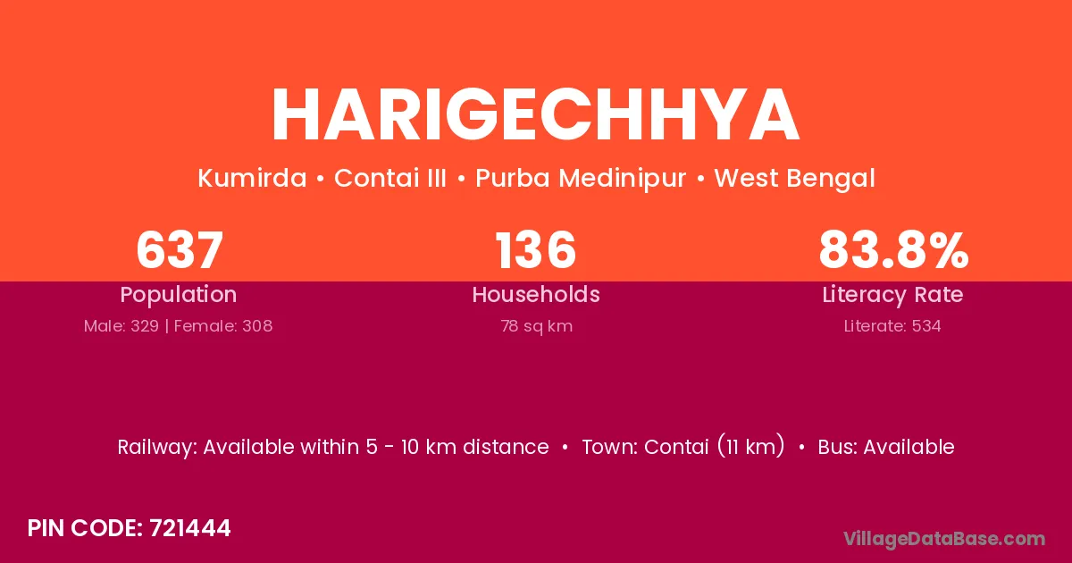 Contai (11 km) is the nearest town to Harigechhya village for major economic activities and is located approximately 11 km away.
