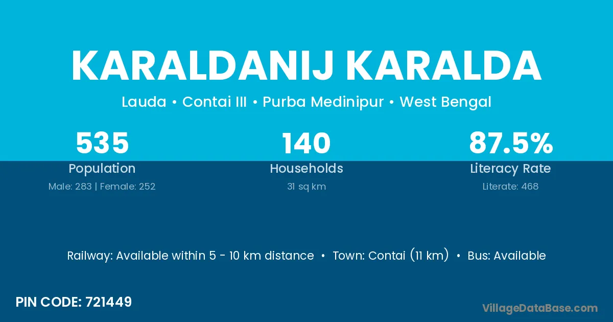 Contai (11 km) is the nearest town to Karaldanij Karalda village for major economic activities and is located approximately 11 km away.