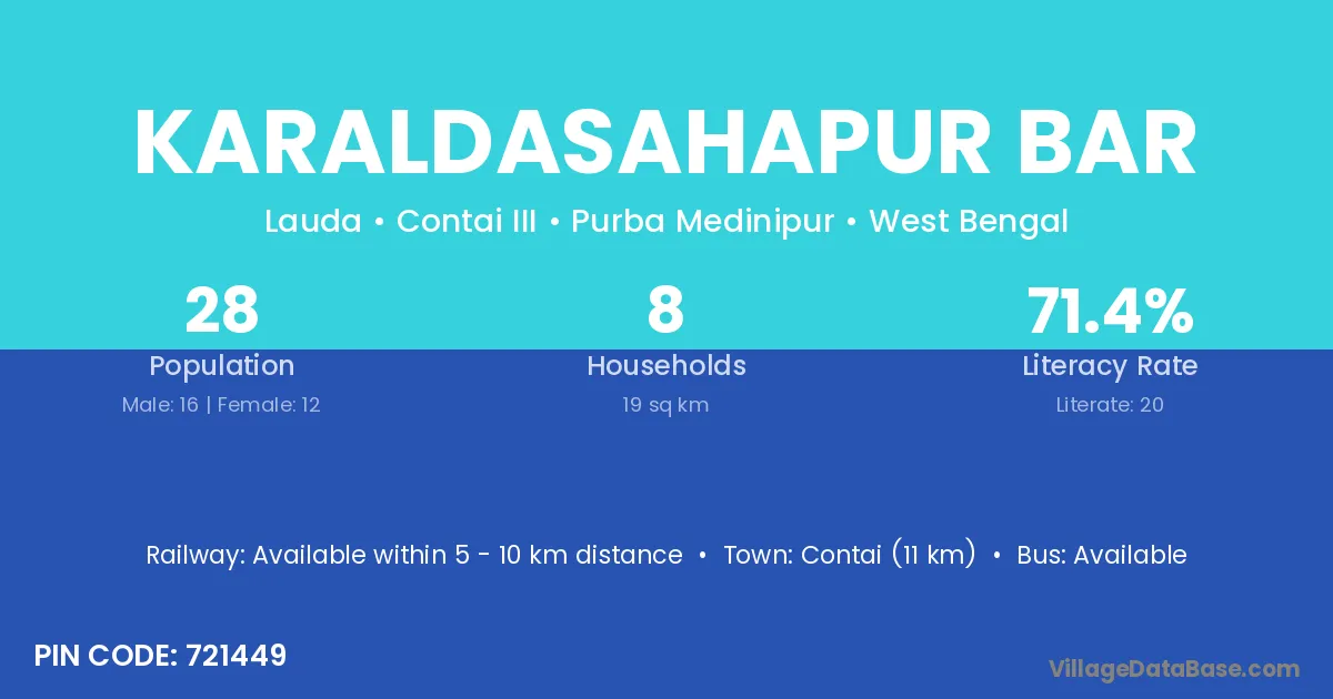 Contai (11 km) is the nearest town to Karaldasahapur Bar village for major economic activities and is located approximately 11 km away.