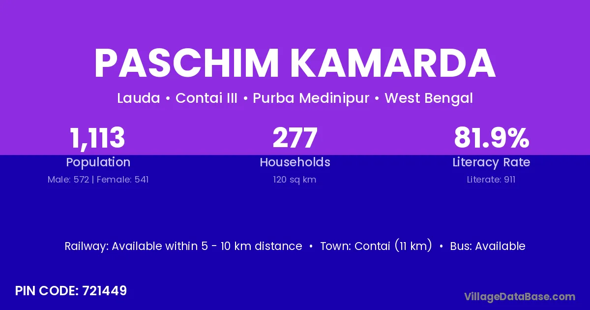 Contai (11 km) is the nearest town to Paschim Kamarda village for major economic activities and is located approximately 11 km away.
