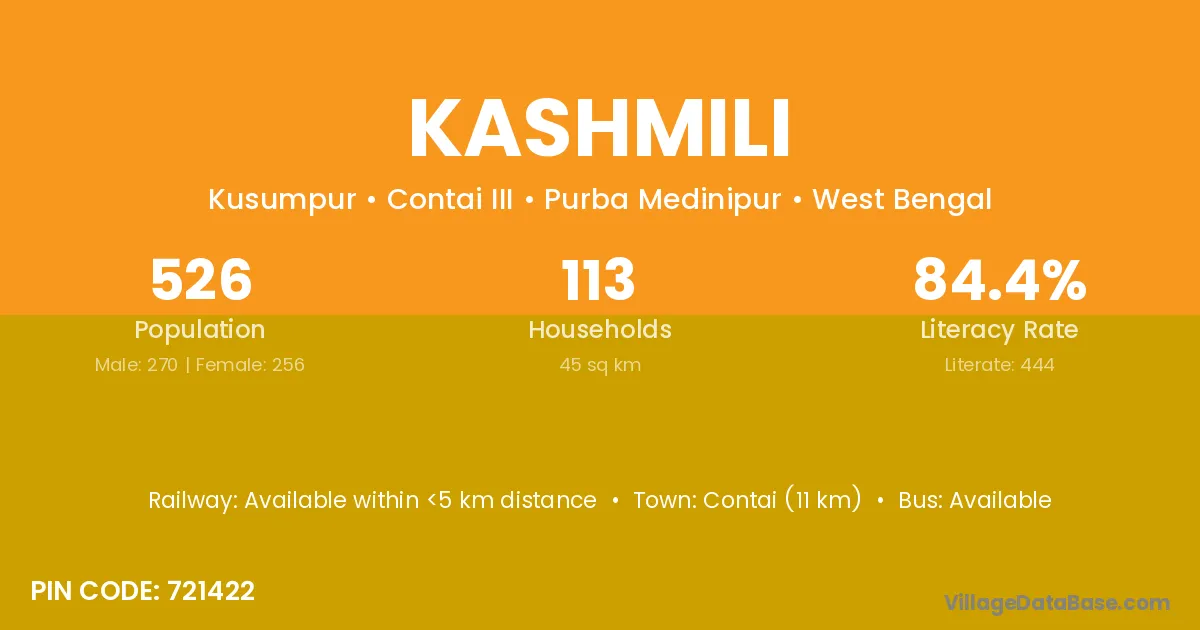 Contai (11 km) is the nearest town to Kashmili village for major economic activities and is located approximately 11 km away.