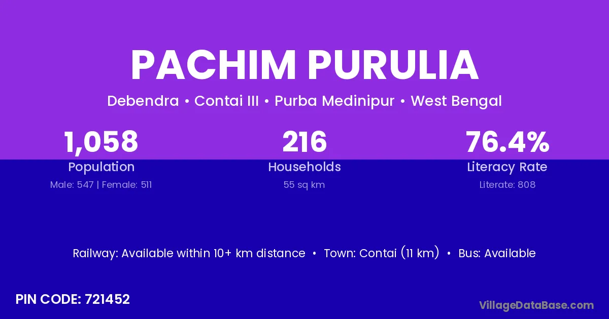 Contai (11 km) is the nearest town to Pachim Purulia village for major economic activities and is located approximately 11 km away.