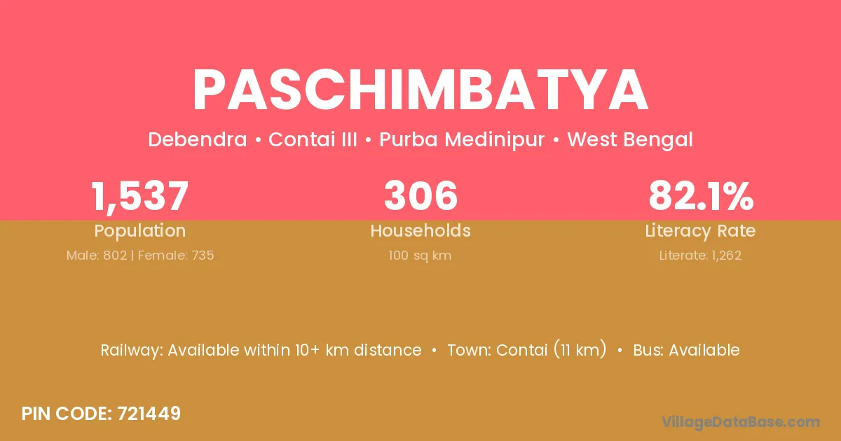 Contai (11 km) is the nearest town to Paschimbatya village for major economic activities and is located approximately 11 km away.