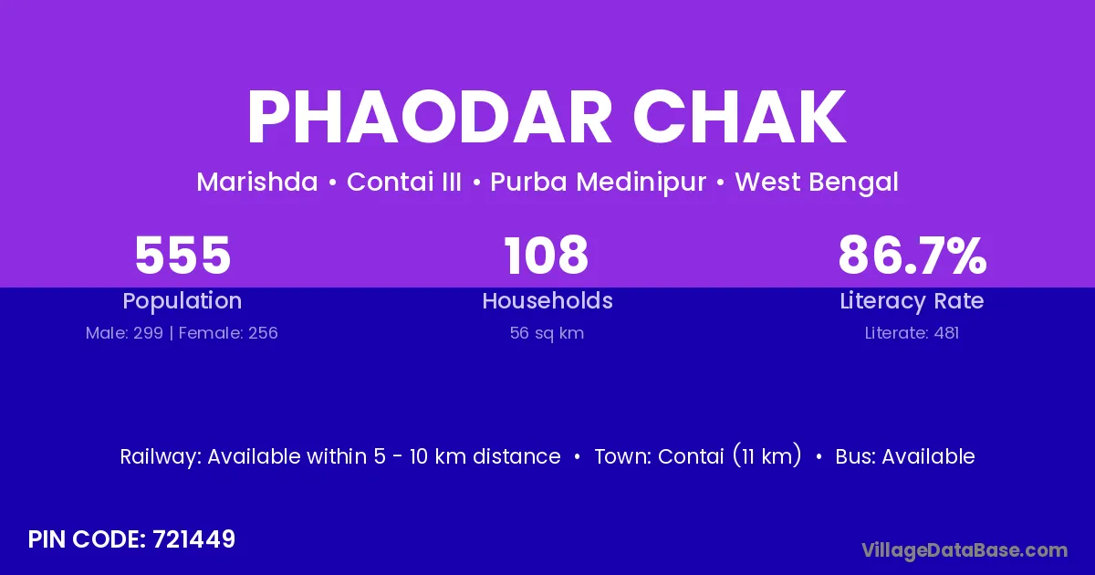 Contai (11 km) is the nearest town to Phaodar Chak village for major economic activities and is located approximately 11 km away.