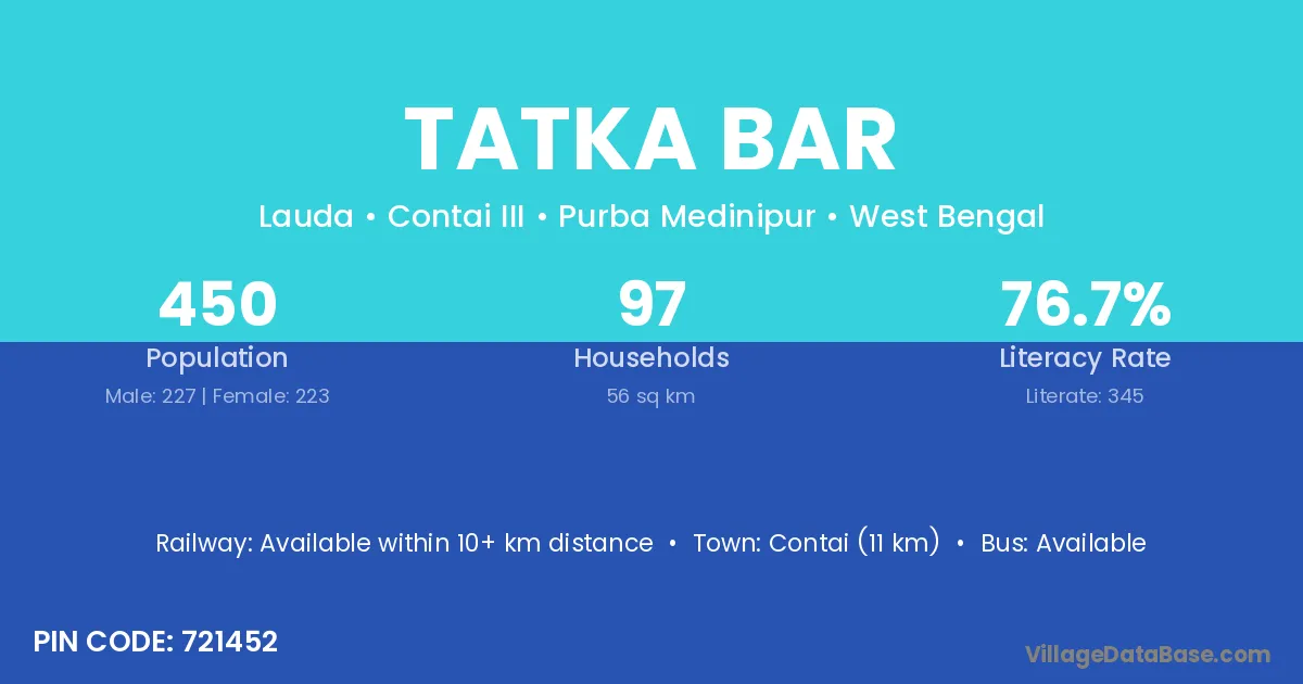 Contai (11 km) is the nearest town to Tatka Bar village for major economic activities and is located approximately 11 km away.
