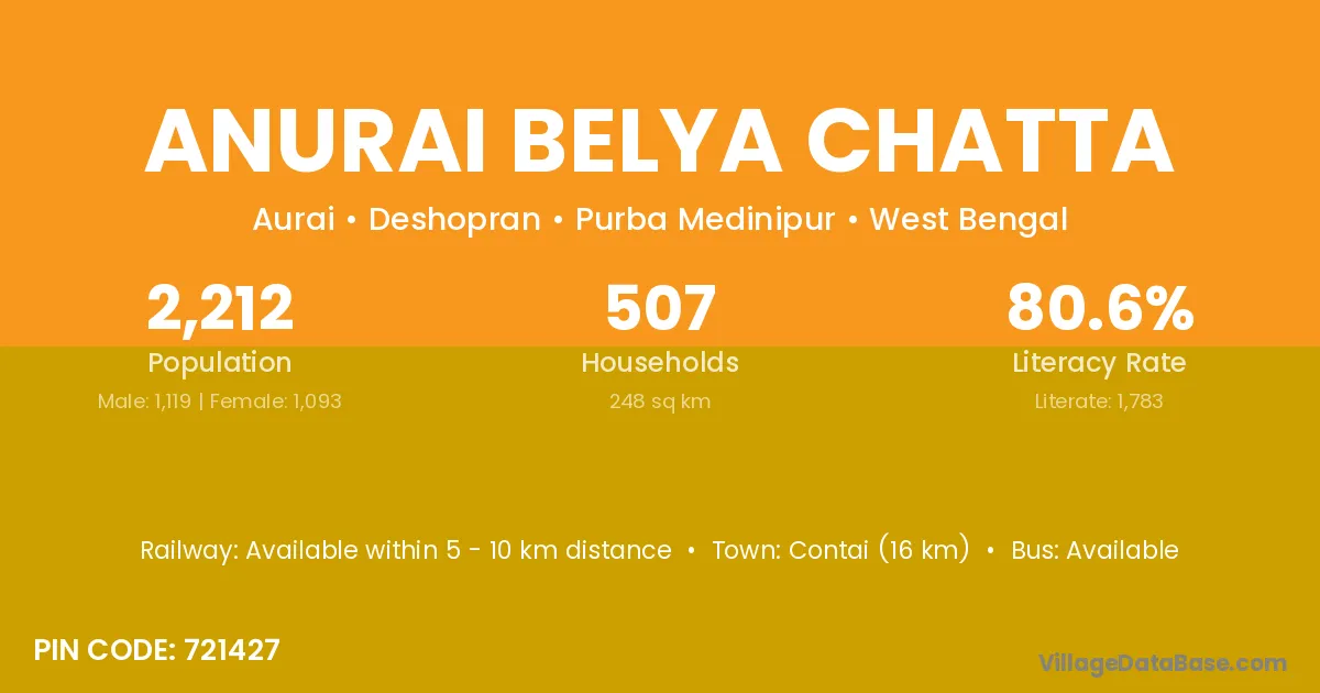 Contai (16 km) is the nearest town to Anurai Belya Chatta village for major economic activities and is located approximately 16 km away.