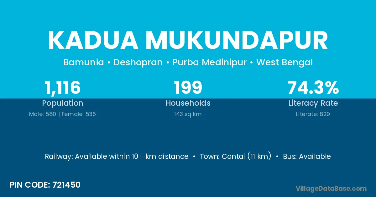 Contai (11 km) is the nearest town to Kadua Mukundapur village for major economic activities and is located approximately 11 km away.