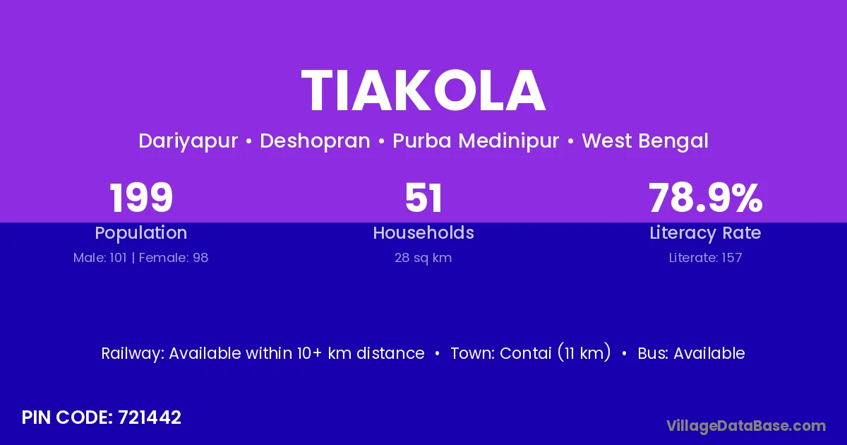Contai (11 km) is the nearest town to Tiakola village for major economic activities and is located approximately 11 km away.