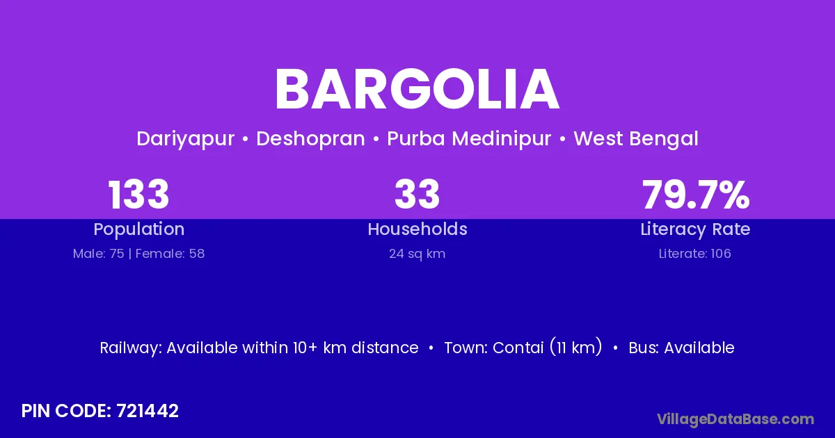 Bargolia village is located in the Deshopran Subdivision of the Purba Medinipur district in West Bengal.